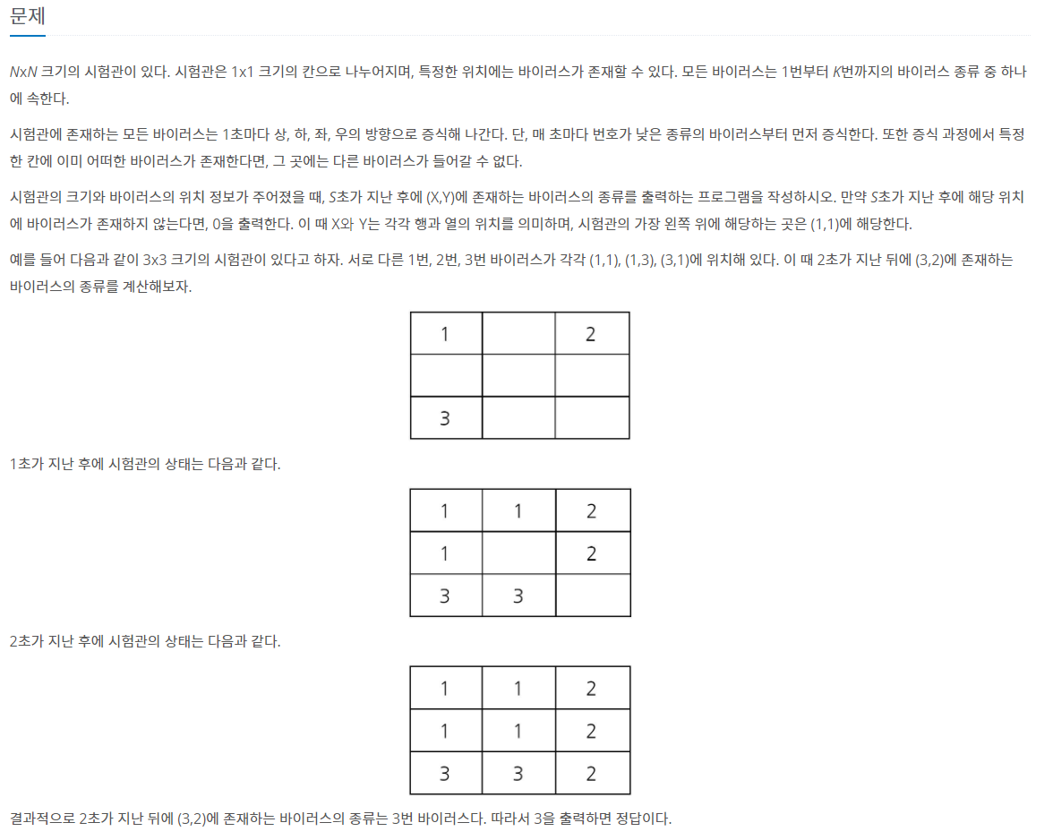 그렇기 때문에 우선순위큐를 cur, next 만든다음에 현재 바이러스에서 퍼진 바이러스는 next 우선순위큐에 넣는다.