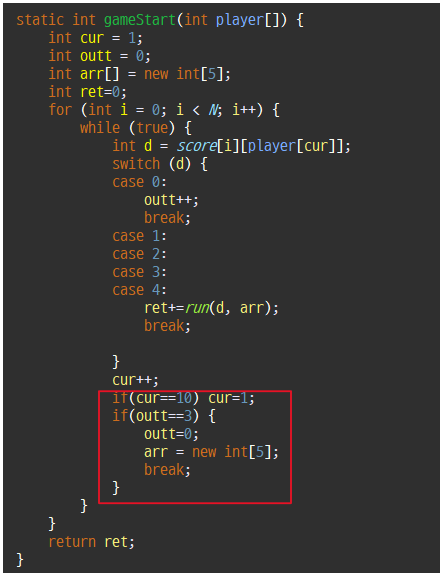 베이스를 3번부터 0번까지 탐색후 arr[4]에 저장된 값이, 방금 선수의 득점이 된다.