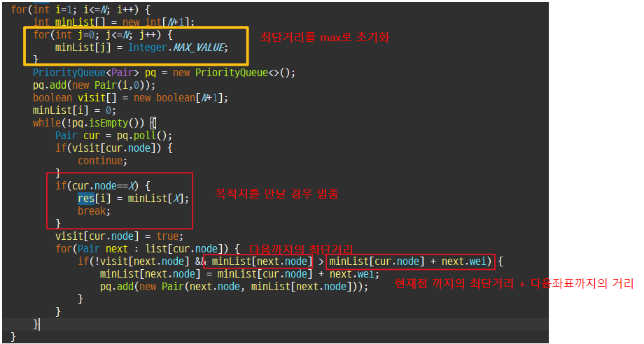 if(!visit[next.node] && minList[next.node] > minList[cur.node] + next.wei) {