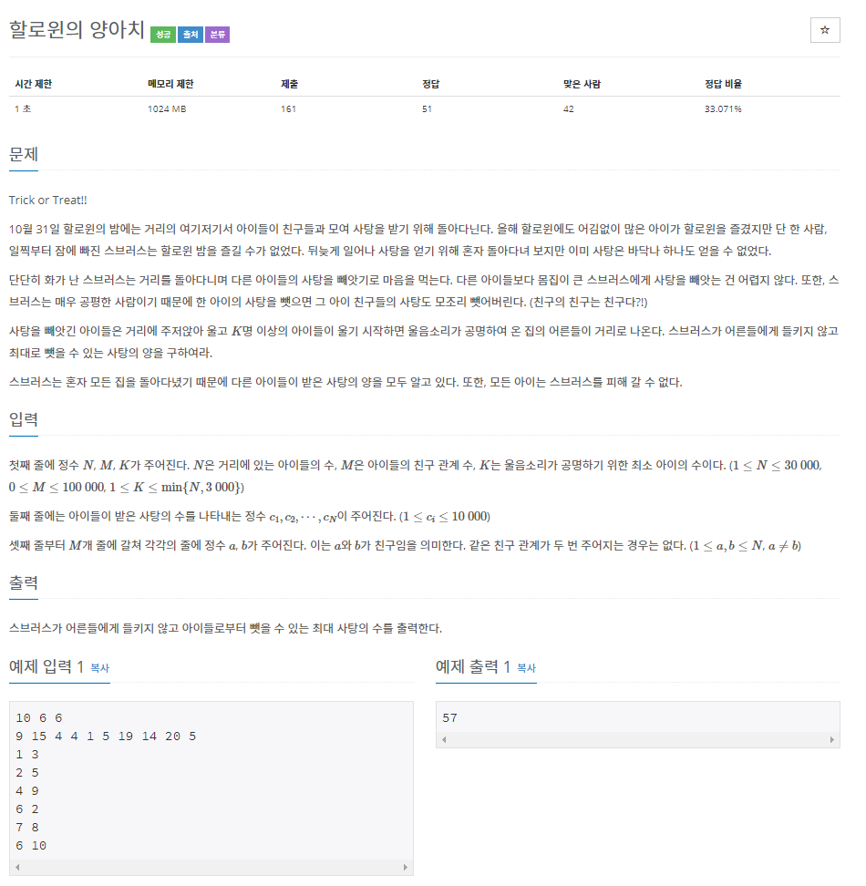 첫째 줄에 정수 $N$, $M$, $K$가 주어진다. $N$은 거리에 있는 아이들의 수, $M$은 아이들의 친구 관계 수, $K$는 울음소리가 공명하기 위한 최소 아이의 수이다. ($1 \leq N \leq 30\ 000$, $0 \leq M \leq 100\ 000$,