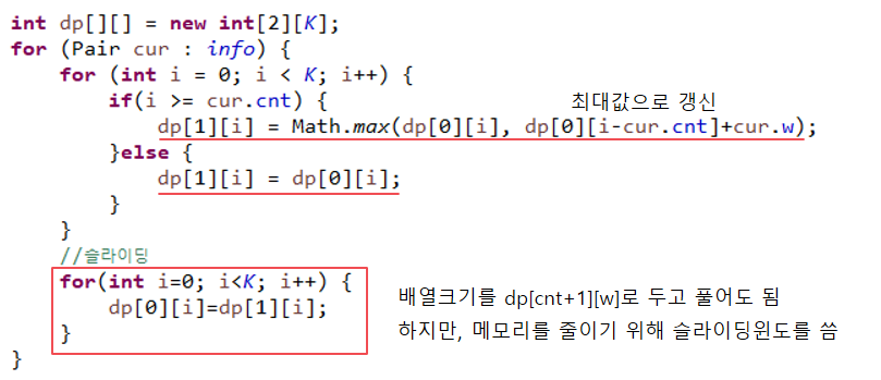 dp[1][i] = Math.max(dp[0][i], dp[0][i-cur.cnt]+cur.w);