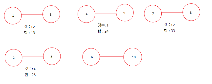 아는 사람끼리 묶고, 합과, 사람수를 구해서 Pair클래스에 입력