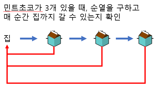 집에서 -> 민트1 -> 민트2 -> .... 민트10-> 집 까지의 시뮬레이션을 돌린다