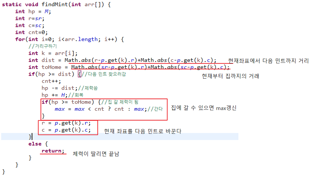 만약 중간에 체력이 떨어져서 다음 민트로 갈수 없다면 반복문을 종료한다.
